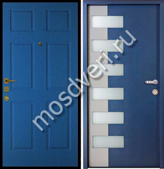 Входная синяя дверь с зеркалом и стеклянными вставками — сочетает в себе современный дизайн и максимальную защиту.